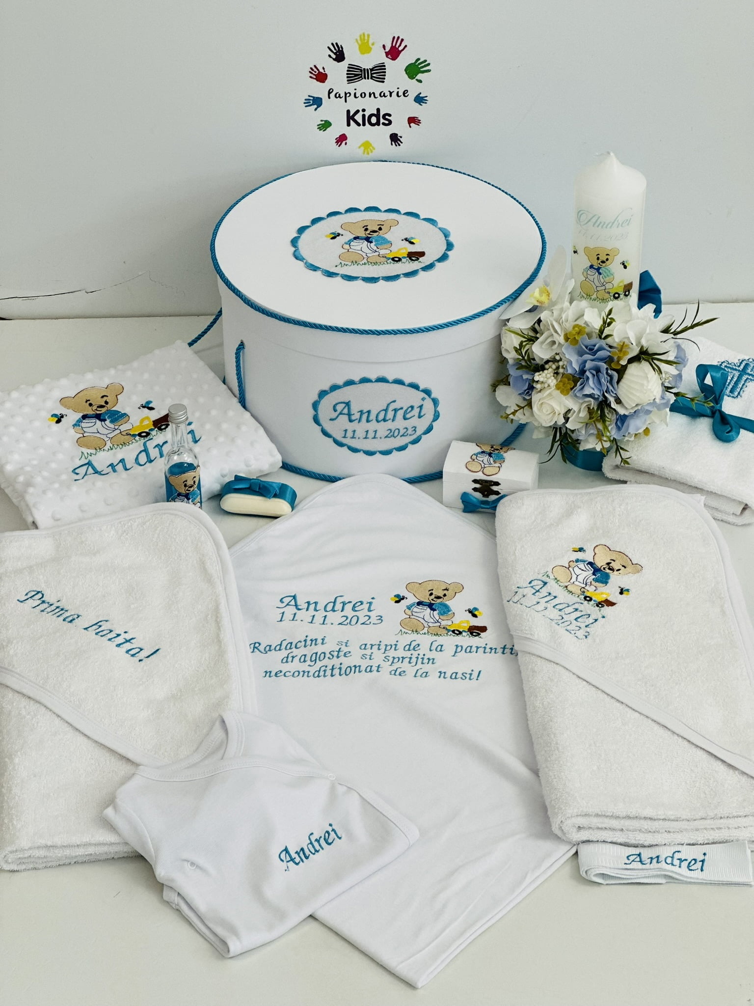 TRUSOUL BEBELUSULUI poate fi personalizat cu numele, data botezului si chiar cu tema aleasa de tine!