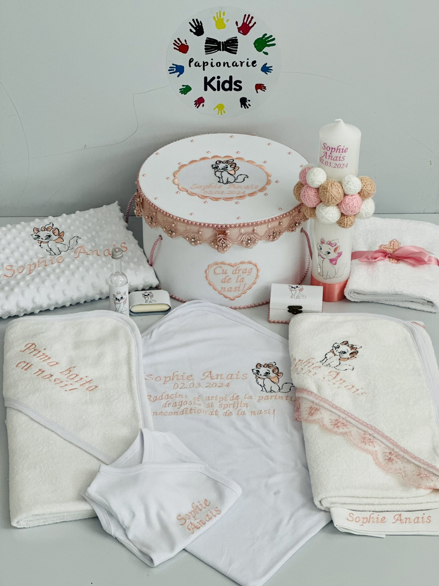 TRUSOUL BEBELUSULUI poate fi personalizat cu numele, data botezului si chiar cu tema aleasa de tine!