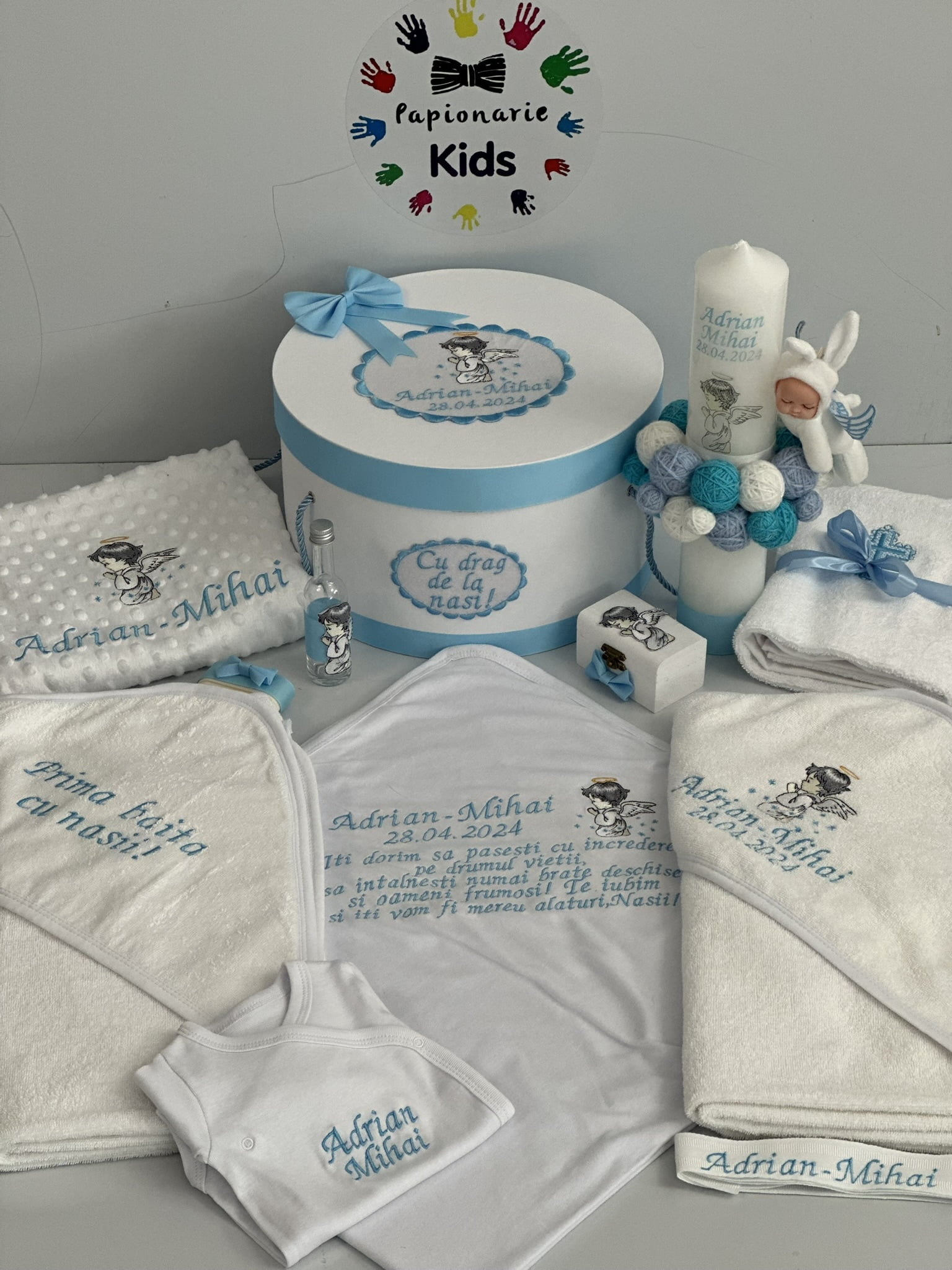TRUSOUL BEBELUSULUI poate fi personalizat cu numele, data botezului si chiar cu tema aleasa de tine!