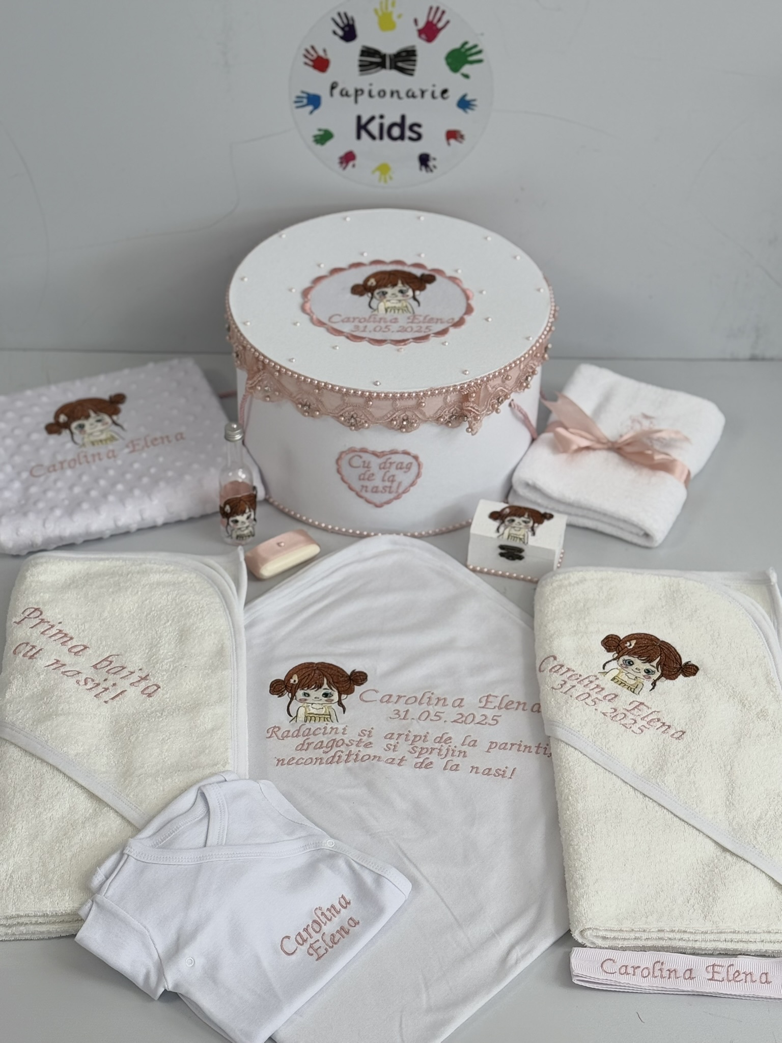 TRUSOUL BEBELUSULUI poate fi personalizat cu numele, data botezului si chiar cu tema aleasa de tine!