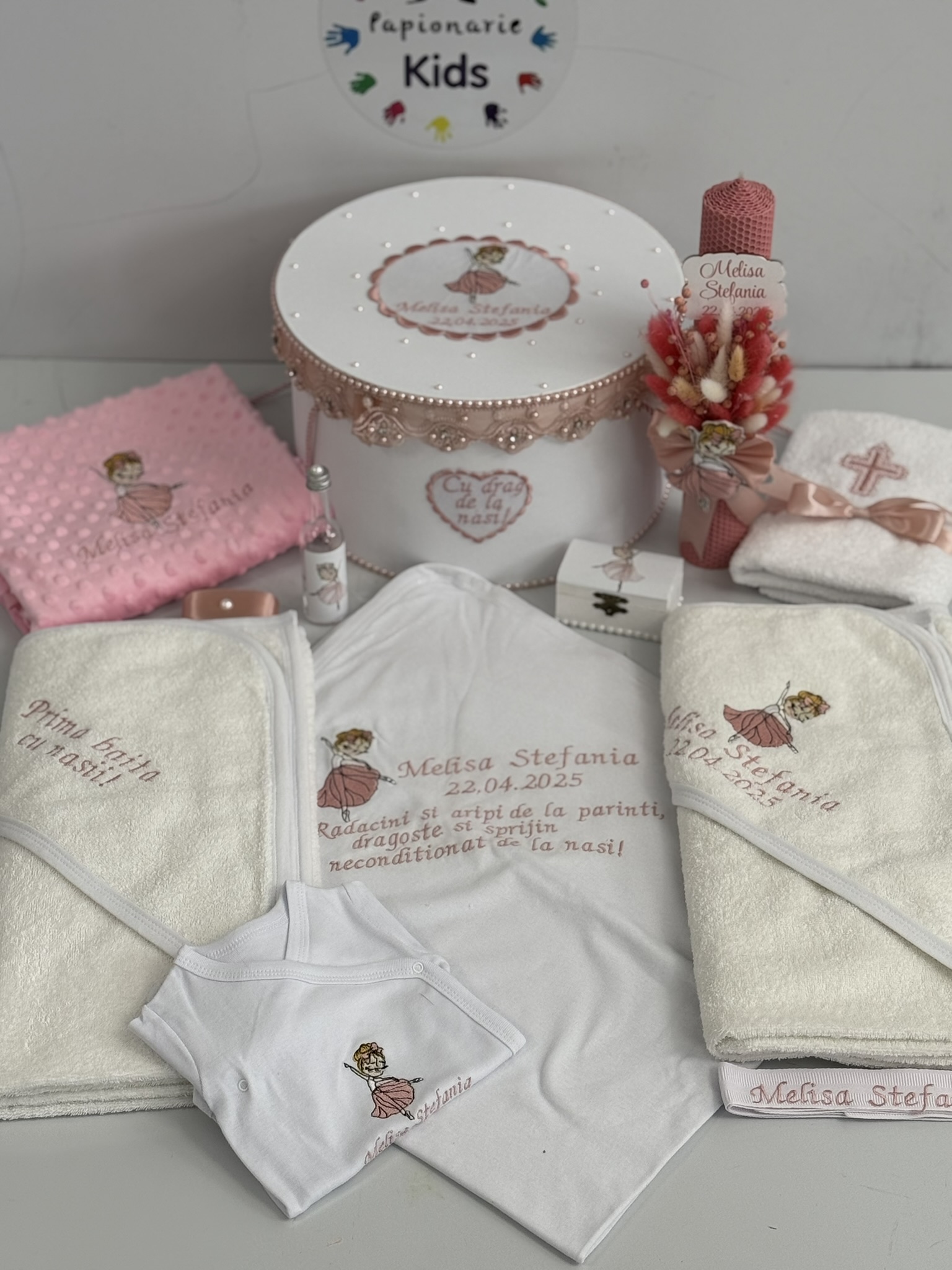 TRUSOUL BEBELUSULUI poate fi personalizat cu numele, data botezului si chiar cu tema aleasa de tine!