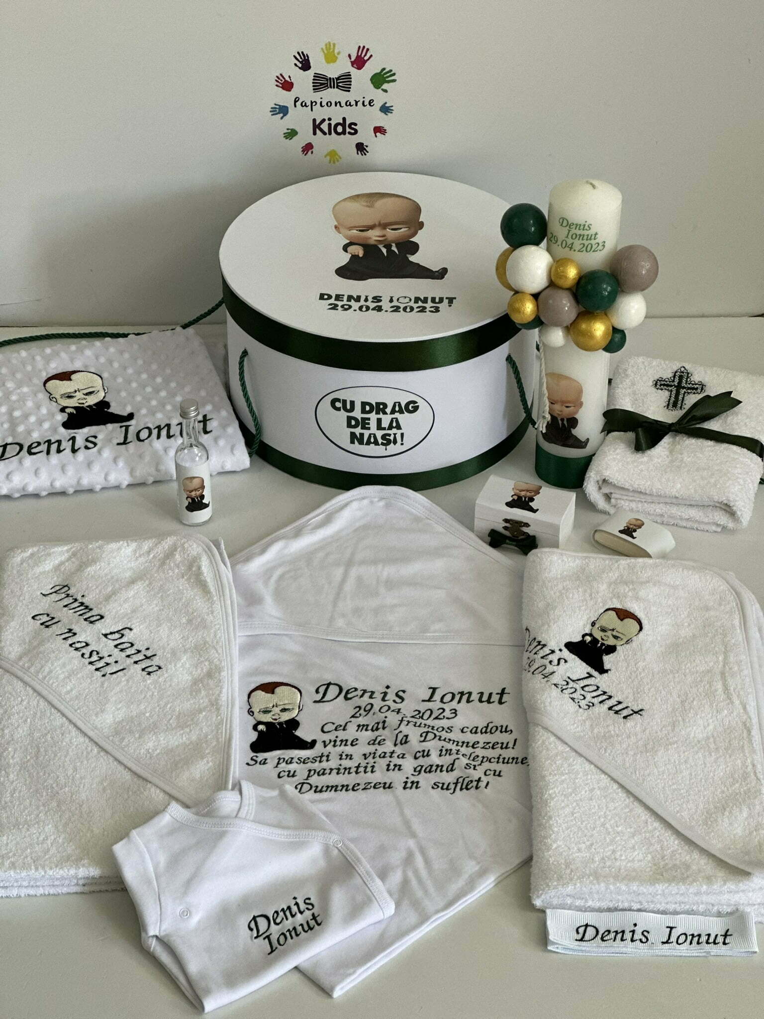 TRUSOUL BEBELUSULUI poate fi personalizat cu numele, data botezului si chiar cu tema aleasa de tine!