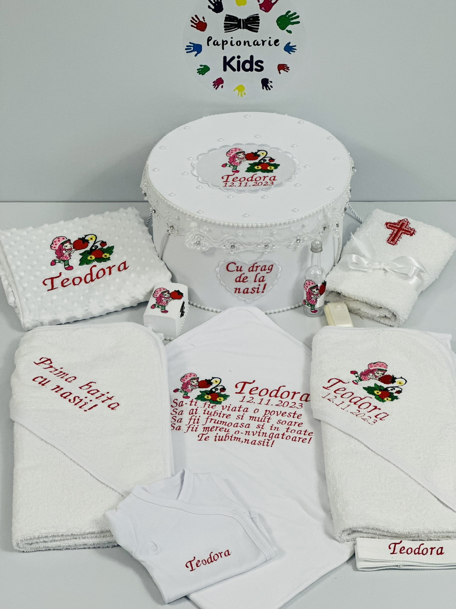 TRUSOUL BEBELUSULUI poate fi personalizat cu numele, data botezului si chiar cu tema aleasa de tine!