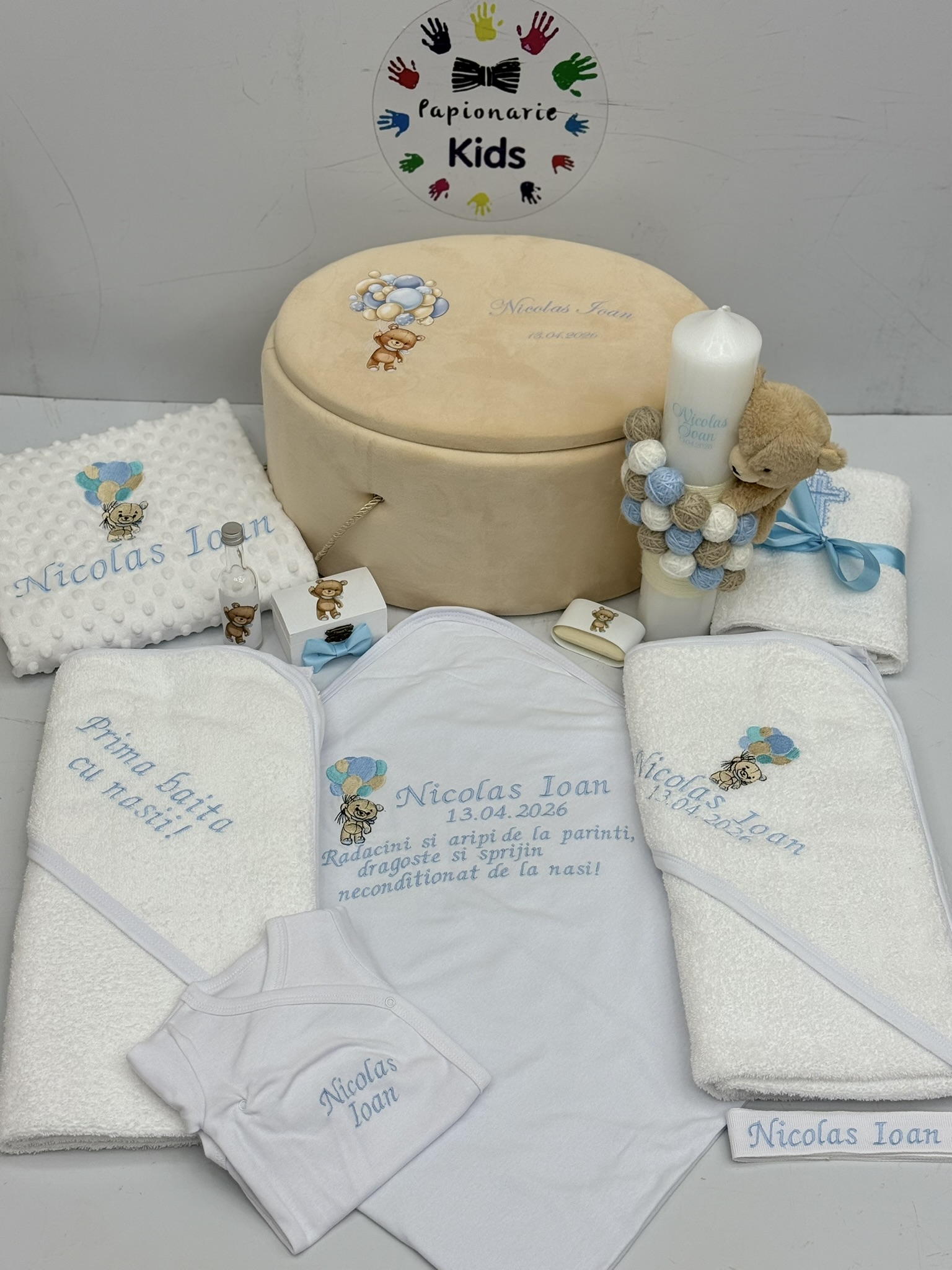 TRUSOUL BEBELUSULUI poate fi personalizat cu numele, data botezului si chiar cu tema aleasa de tine!