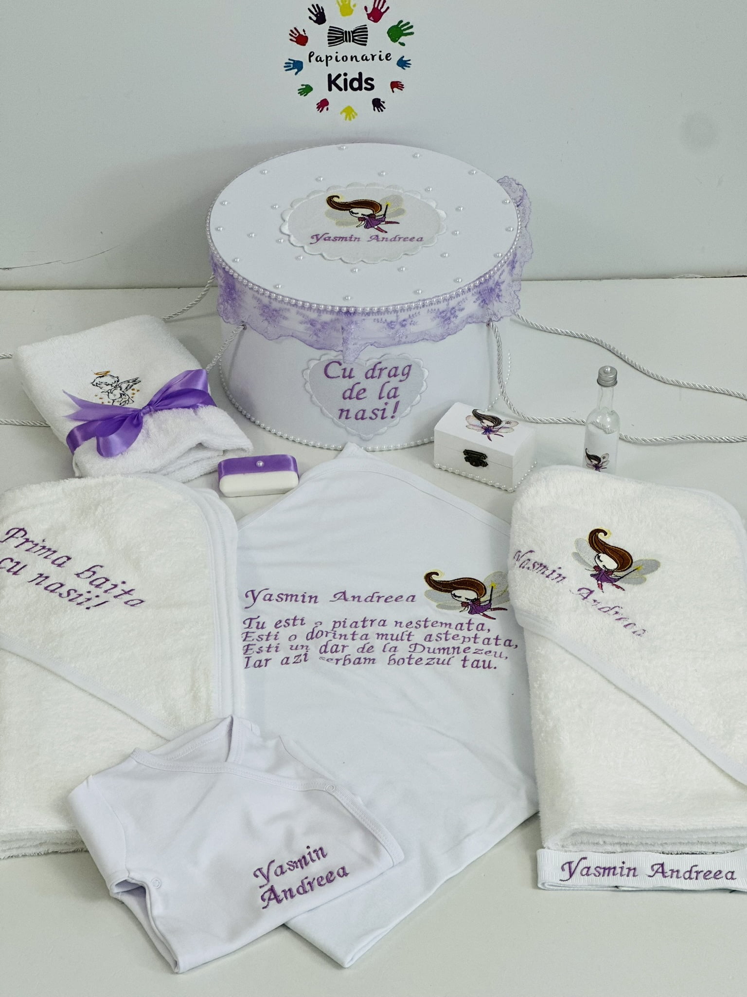 TRUSOUL BEBELUSULUI poate fi personalizat cu numele, data botezului si chiar cu tema aleasa de tine!