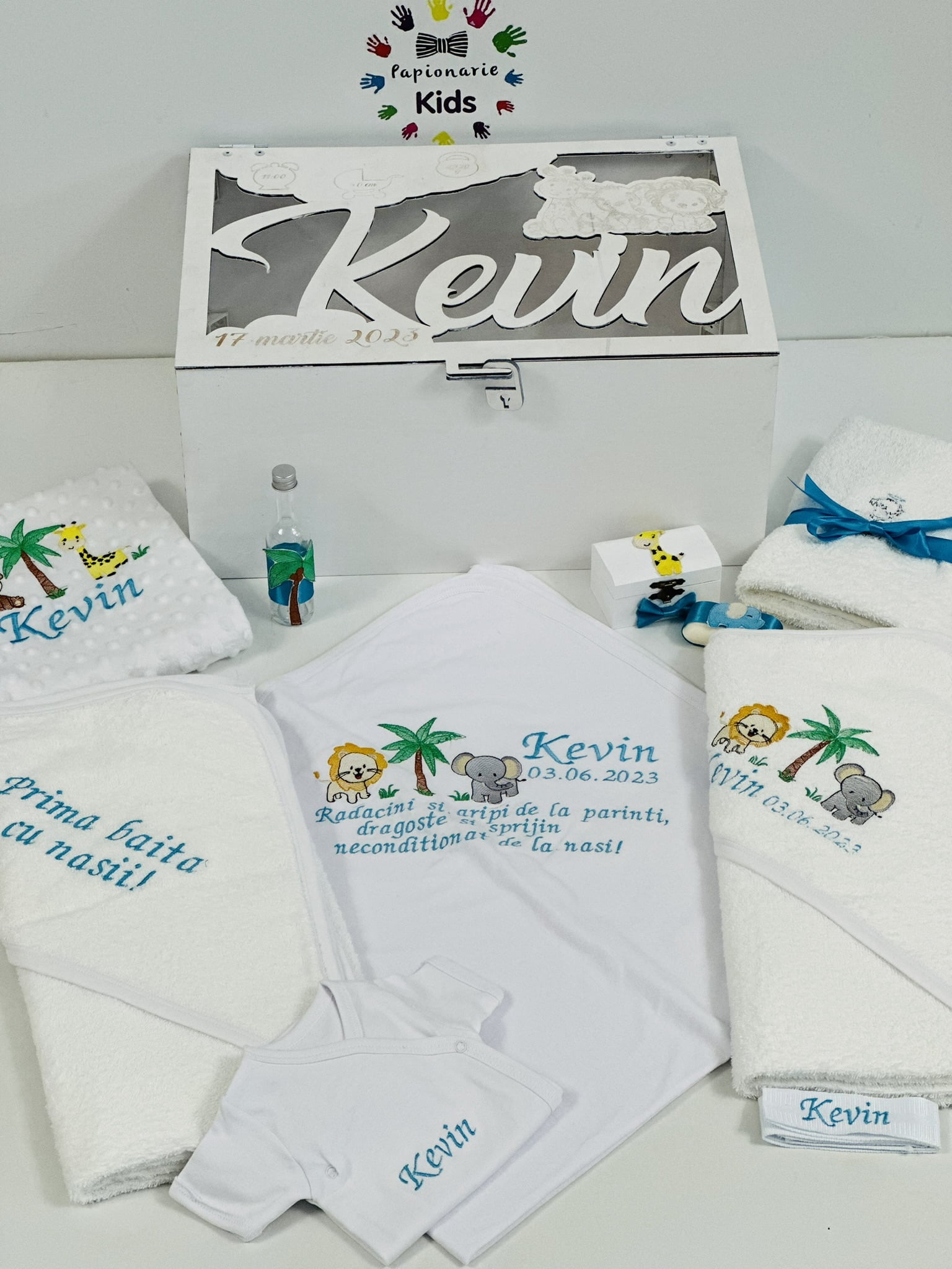 TRUSOUL BEBELUSULUI poate fi personalizat cu numele, data botezului si chiar cu tema aleasa de tine!