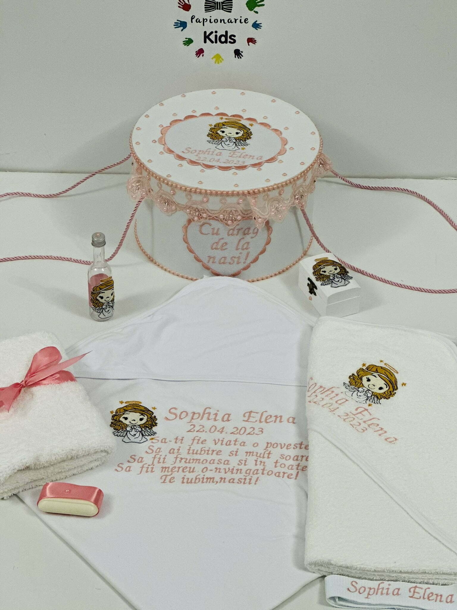 • Cutie rotunda personalizata cu tematica, nume si data (D.26 cm,brodata,dantela,panglica,etc)