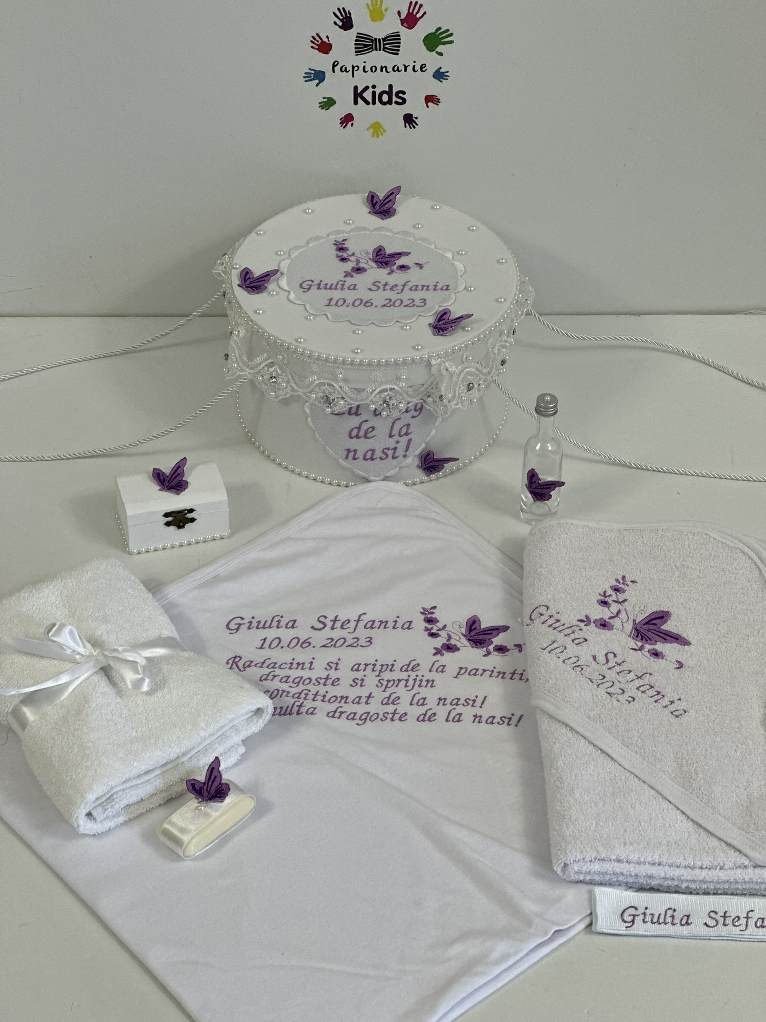 • Cutie rotunda personalizata cu tematica, nume si data (D.26 cm,brodata,dantela,panglica,etc)